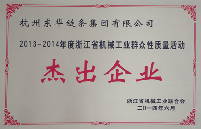 65日至7日,由檢測公司組隊,代表集團公司參加2013年至2014年度浙江省機械工業優秀質量管理(QC)小組成果發表會。全省40余家企業的75QC成果發表。經過兩天的發表與評比,最終,檢測公司的《降低客戶投訴損失額》和工程鏈事業部的《提升大規格鏈板沖裁質量》分別獲得一等獎,工程鏈事業部的《減少81X鏈條不良率及提升產能》獲得二等獎。同時公司獲得了“2013-2014年度浙江省機械工業群眾性質量活動杰出企業”稱號;副總經理袁立華獲得“2013-2014年度浙江省機械工業群眾性質量活動優秀工作者”榮譽稱號。