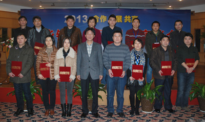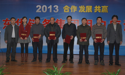最后,內(nèi)銷公司總經(jīng)理戴迪漢分別宣讀了東華集團(tuán)和盾牌公司2012年優(yōu)秀經(jīng)銷商名單,宣碧華董事長向優(yōu)秀經(jīng)銷商頒發(fā)了榮譽證書并合影留戀。