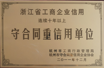 鑒于東華集團長期以來在企業發展中誠信、守合同重信用,日前被杭州市工商信用管理局、杭州市守合同重信用企業協會聯合授予浙江省工商企業信用連續十年以上“守合同重信用”單位榮譽稱號。
