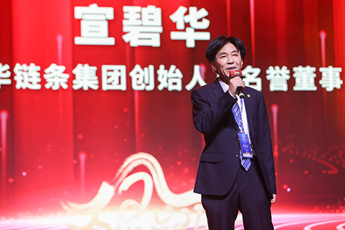 “鏈動世界”的開場舞后,集團創始人、名譽董事長宣碧華致辭。他說,東華三十年來從小做到大,產品從少做到多,從中國做到全球,從專注做到專業,從耐心做成迷戀。三十年來得到員工的擁護,用戶的認可,同行的尊重。三十年中,我們穩健經營,專注制造業,為了預防風險,東華三十年中消化了冷落,扛住了壓力,遵守誠信,擔當責任,創造價值。常言道十年磨一劍。東華三十年磨三把劍,誠信、責任、價值。今天東華還在路上,還要繼續擔當下去。感謝各位多年來對東華的支持,也感謝今天沒有來參加這次慶典大會的東華員工以及上下游產業鏈的朋友,祝大家身體健康、事業有成、家庭幸福。