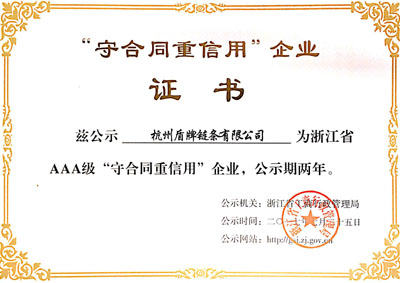 日前,杭州盾牌鏈條有限公司被浙江省工商行政管理局認定為2017年度“浙江省AAA級守合同重信用企業”,這是繼2015年首次獲得“AA級守合同重信用”企業在合同管理及履行上的又一次進步。盾牌公司會一如既往重視企業合同信用管理,不斷提高企業合同管理水平。