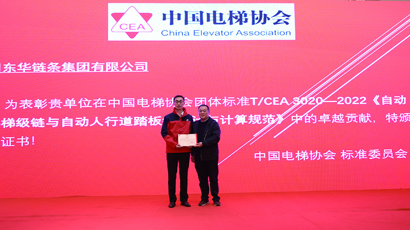 近日,中國電梯協(xié)會標準委員會授予東華鏈條集團榮譽證書,以表彰東華在中國電梯團體標準T/CEA 3020-2022《自動扶梯梯級鏈與自動人行道踏板鏈設計與計算規(guī)范》中的卓越貢獻。東華扶梯工程鏈事業(yè)部代表公司出席了頒獎儀式。
