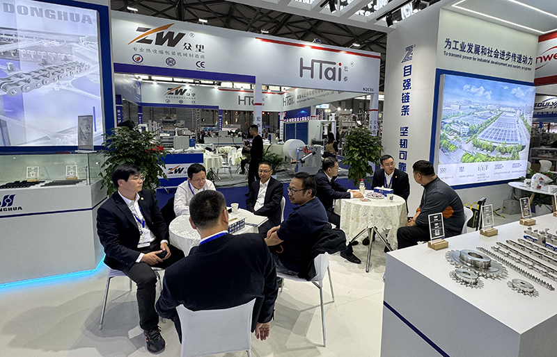 展會上,東華不銹鋼鏈、空心銷軸鏈、橡膠鏈、薄膜拉伸鏈、免潤滑鏈、鏈輪等食品包裝、新能源、印鐵烘房等產品亮相,其中一臺夾膜鏈系統化設備吸引了許多主機客戶前來參觀交流。