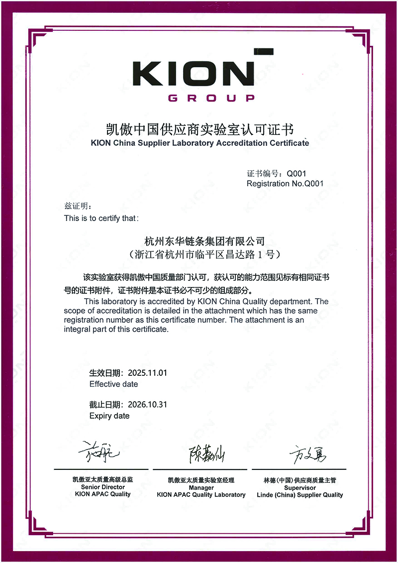 近日,東華鏈條成功通過凱傲集團中國供應商實驗室審核認可,并榮獲證書(編號:Q001),成為凱傲集團本年度首家通過該項審核的供應商。