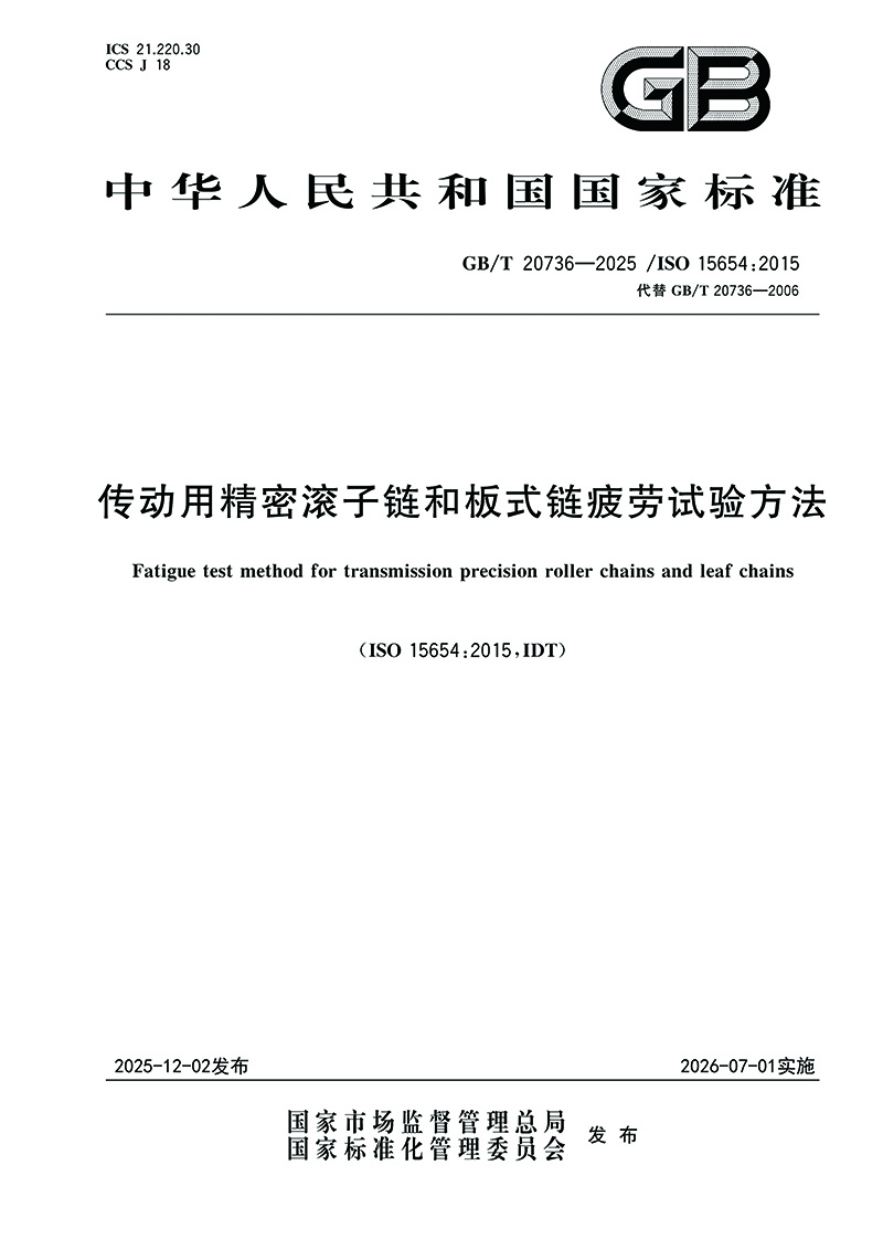 近日,國家市場監督管理總局和國家標準化管理委員會聯合發布了261項推薦性國家標準。其中,由全國鏈傳動標準化技術委員會歸口、東華鏈條集團負責及參與研制/修訂的兩項新版鏈傳動國家標準正式獲批,分別為GB/T 20736—2025《傳動用精密滾子鏈和板式鏈疲勞試驗方法》和GB/T 6074—2025《板式鏈、連接環和槽輪 尺寸、測量力、抗拉載荷和動載載荷》。兩項新標準將于2026年7月1日起實施。